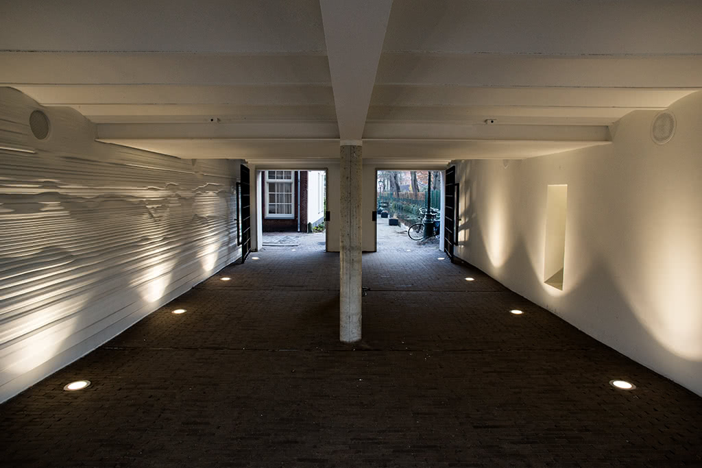 Fluisterende Wind kon relatief eenvoudig in het totaalontwerp van het P. J. Vethgebouw en de tunnel geïntegreerd worden omdat al in een zeer vroeg stadium overeenstemming was bereikt dat dit kunstwerk hier een plek zou krijgen.